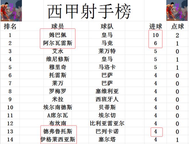 射手榜方面,姆巴佩和哈兰德现在是隔空较起了劲,哈兰德8轮打入11球,姆巴佩今天打入绝杀球后9轮打入10球,也上了双。西甲第2和英超第2都一样,阿尔瓦雷斯打入6球。维尼修斯,艾永和穆里奇5球并列第3。德弗鲁托斯今天梅开二度后,追上莱万,托雷斯等人4球刚好挤入前十。
