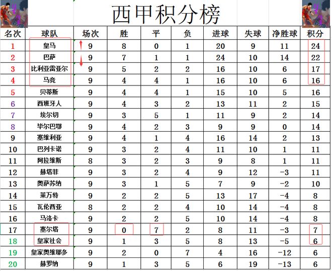 积分榜方面,击败赫塔菲后皇马再次重启连胜模式,再超过巴萨2分夺回榜首。比利亚雷亚尔差皇马7分排在第3,马竞差皇马8分排在第4。塞尔塔今天又平了,妥妥的平局王,9轮就平了7场,还没有拿到赛季首胜的他们只比降级区高了1分。