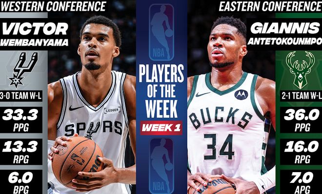 第一则:周最佳球员诞生,字母哥文班亚马当选NBA官方公布了第1周的东西部周最佳球员,东部由雄鹿前锋字母哥当选,西部由马刺中锋文班亚马当选。字母哥上周场均爆砍36分+16篮板+7助攻+1盖帽的豪华数据,带领雄鹿取得2胜1负的战绩。据统计,字母哥是NBA历史上首位在赛季前3战至少砍下100分+40篮板+15助攻的球员。同时,这是字母哥生涯第28次拿到周最佳,排在队史第1位。文班亚马上周场均豪取33.3分+13.3篮板+2.3助攻+1.7抢断+6盖帽的豪华数据,带领马刺取得3胜0负的战绩。据统计,文班亚马是NBA历史上首位赛季前3战至少砍下100分+40篮板+15盖帽的球员。同时,这是文班亚马生涯第2次拿到周最佳。值得一提的是,库里、东契奇、里夫斯、亚历山大、三球、布伦森、小艾、马克西、米切尔、鲍威尔等人获得了周最佳提名。