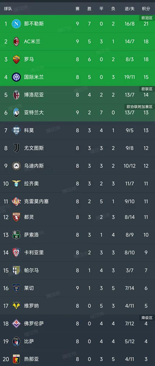 北京时间10月29日,意甲第9轮率先结束了两场比赛,最新积分榜如下!